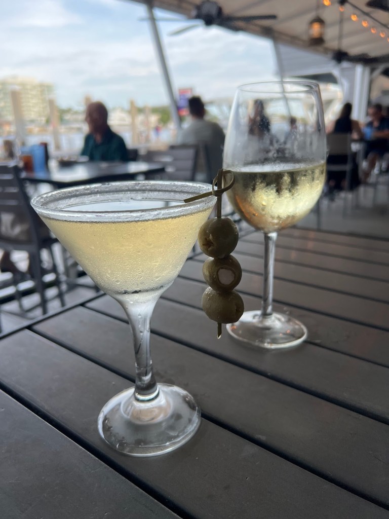 She went with a glass of Kim Crawford Sauvignon Blanc. I, meanwhile, went with The Fisheries Dirty Martini ( Belvedere Organic Vodka & olive juice, chilled, and served with Bleu Cheese stuffed olives).