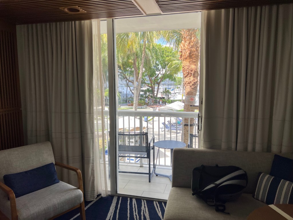 When we were checking in, the guy at the front desk said the room we were assigned was not ready yet but that we could pay a fee for an early check-in. Which, like, I did because I’m an idiot maybe? On account of when we got to our room, we realized it did not have the view we wanted of the marina and instead had a view of the pool.