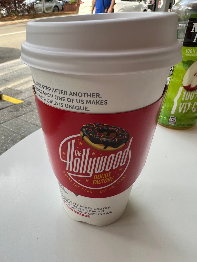 But yeah, I got a cappuccino. Nickie got an apple juice and we set up at the table outside the Hollywood Donut Factory to do a little people-watching while we decided on dinner. We were all back and forth on what we wanted to do – do we eat somewhere on Las Olas? Do we head to the beach? Burger King?