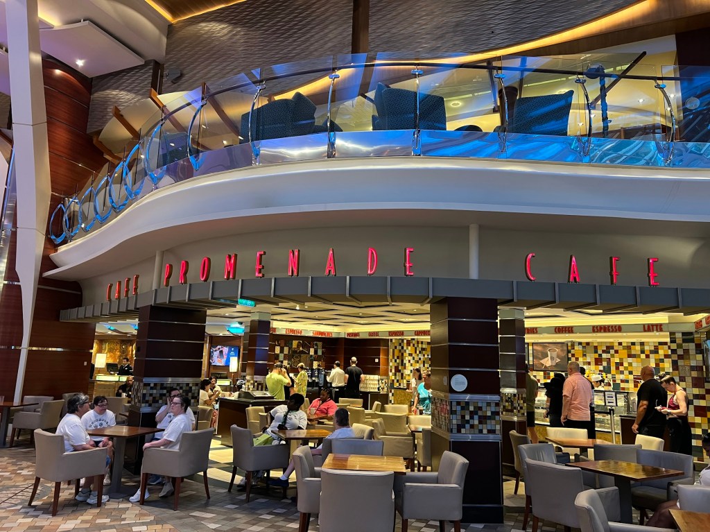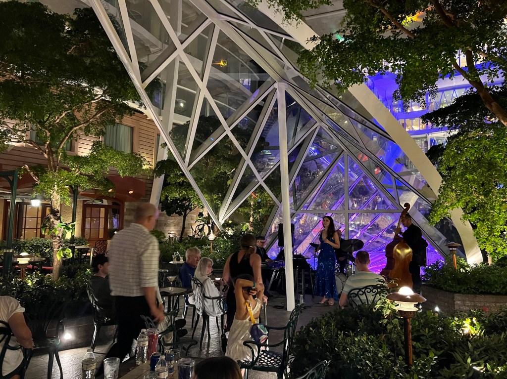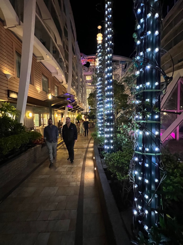 We were probably done and out of the dining room by like 9:30ish. And we both were in the mood for a walk. Which like, these Oasis-class ships facilitate pretty well. While you could go for a walk around the ship or on the actual walking/running deck (which we do later in the trip), the ship legit has a park you can walk through – Central Park. And I know I have mentioned it before, but the fact that this place is filled with live plants and trees is kind of mind-blowing to me.