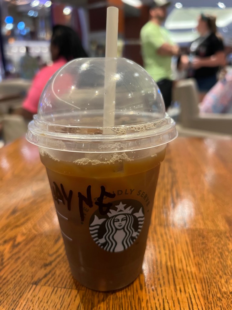 Workout finished, I made my way back up to the room to rejoin Nickie and get ready for the day. We got ready for our day of exploring the ship and then walked on down back to the gym/spa area to get some smoothies. I think I went with some sort of fruity-milky-spinachy situation.