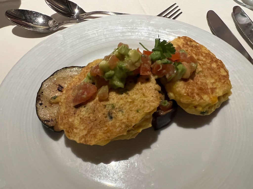 But right. My first actual course were these Grilled Sweet Corn Cakes (served with grilled vegetables, tomato avocado salsa, and fresh cilantro).