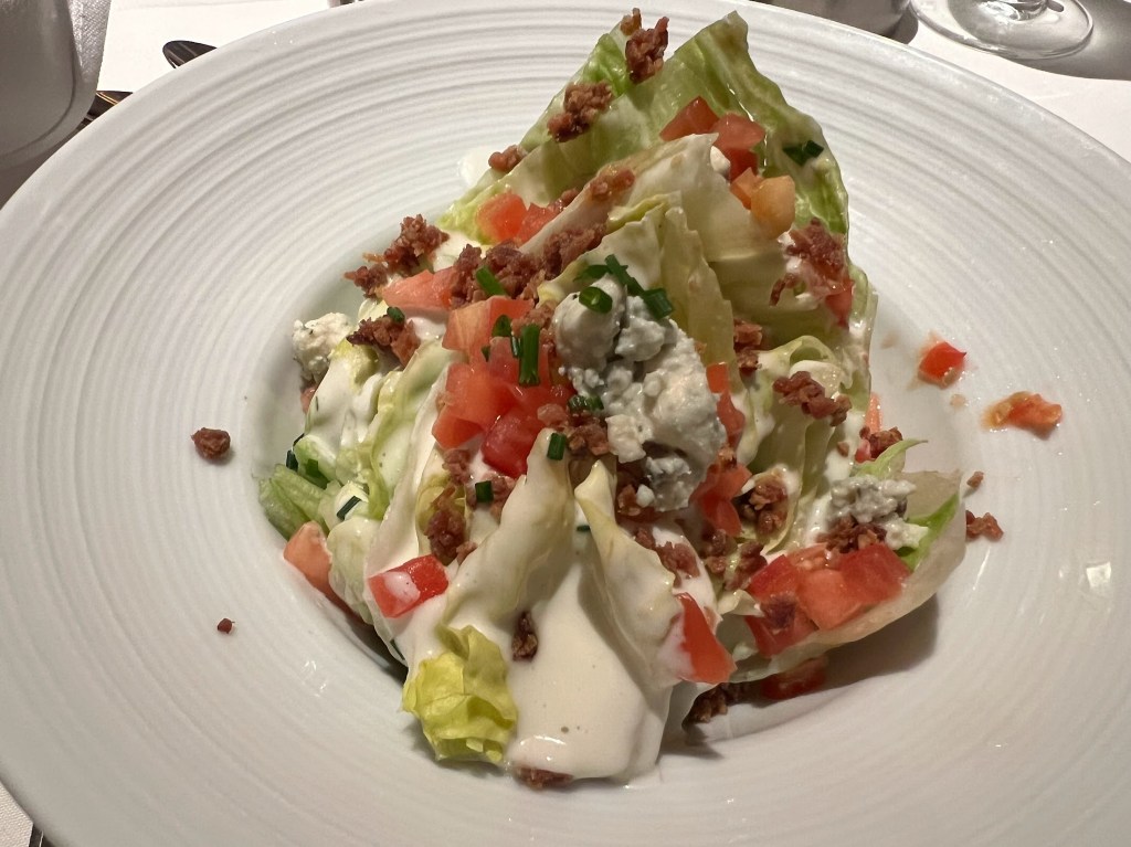 Nickie didn’t get a starter, but I went with the Iceberg Wedge Salad (chilled iceberg lettuce, tomatoes, bacon, and chives drizzled with blue cheese dressing).