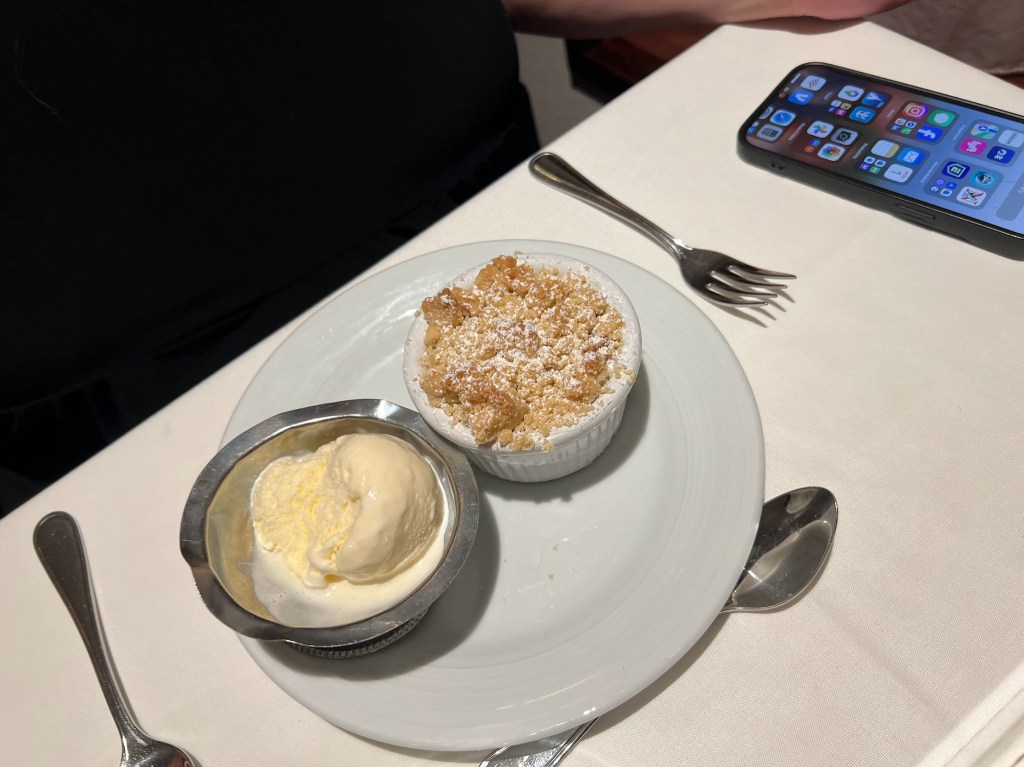 We went with two desserts to share tonight – the Crème Brulee and the Warm Apple Cobbler served with Vanilla Ice Cream.