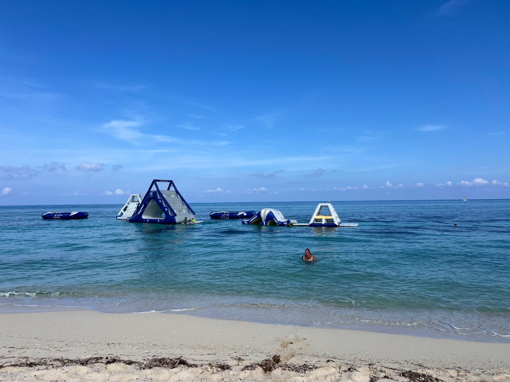 When I got back from the bar, Nickie was already in the water. Right in front of the aqua inflatable park thingy.