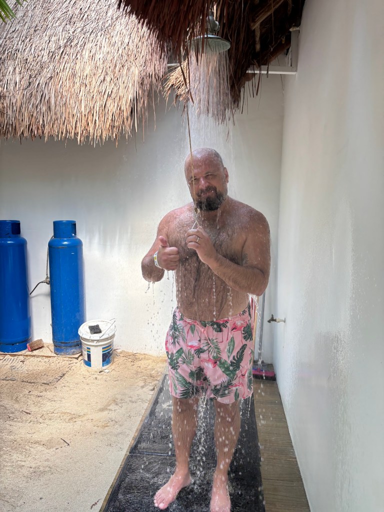 At around 10:30, it felt like the right time to put some food on top of all that alcohol so we made the decision to have an early lunch up at the grill. Before eating, Nickie and I both hit the restrooms behind the grill and Nickie took a picture of me in the shower.