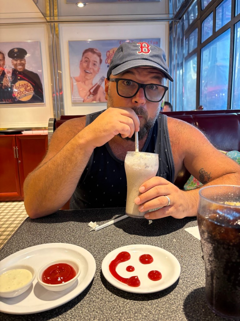 Also, like I said. I did get some pizza. But even though she was feeling better, Nickie still wasn’t pizza-ready. She opted instead to, after trivia had ended, grab a grilled chicken sandwich from Johnny Rocket’s on Deck 6. I of course got no pictures of the chicken sandwich due to my phone charger being a jerk but Nickie did snap one of me enjoying my Strawberry Shake (which btw was included as part of the Refreshment Package).