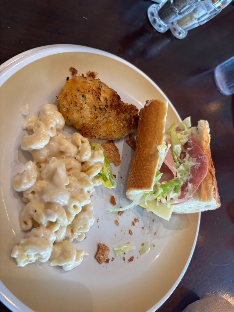 Up there, I got some chicken cutlet kind of situation, made myself a little Italian sub at the deli section, and had some macaroni salad. Aside from the macaroni salad, it was all pretty mid. I mean, the sandwich was fine, but the bread was a little stale and that chicken was dry AF.